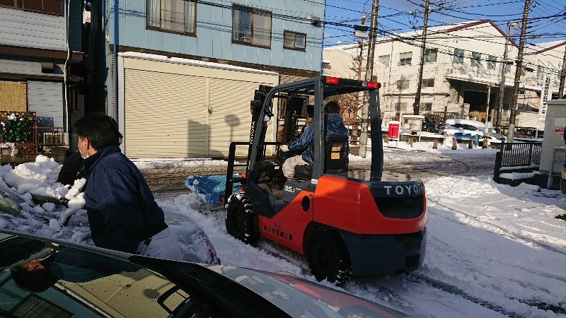 工場長がフォークリフト車をうまく利用して除雪しようと試みましたが...