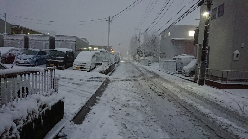 会社付近の道路も夕方にはすっかり雪景色、さらにこの後もどんどん振り続けます。