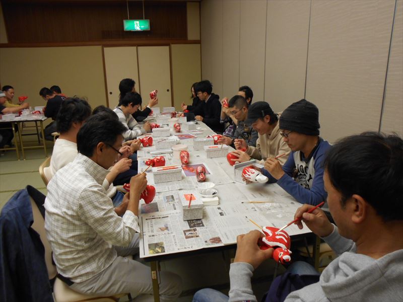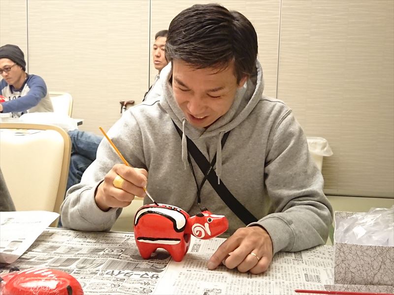 チェックイン後すぐに、地元の郷土文化「赤べこの絵付け体験」を行いました。