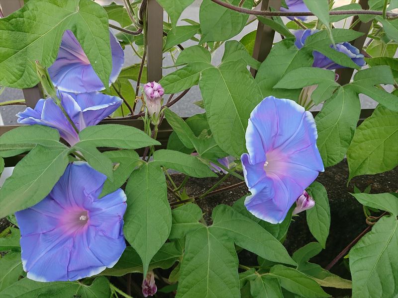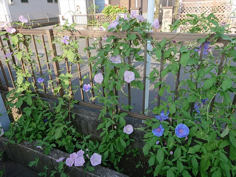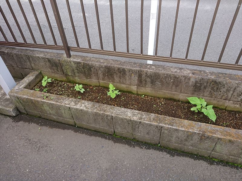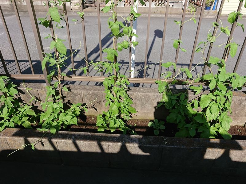 三英空調工業の入口両脇にある花壇、その片側に今年はアサガオを植えました。