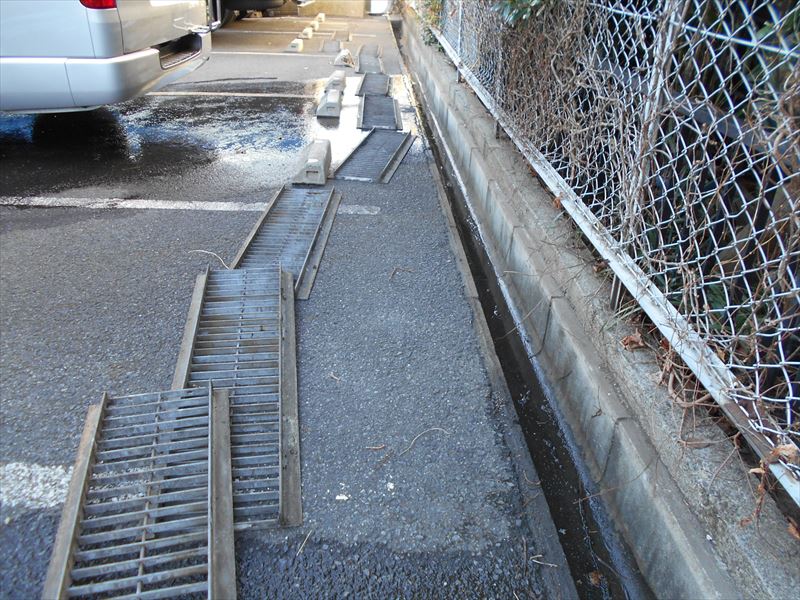敷地内の溝には落ち葉や泥がたくさん溜まっていたのでグレーチングを外し根こそぎ除去。