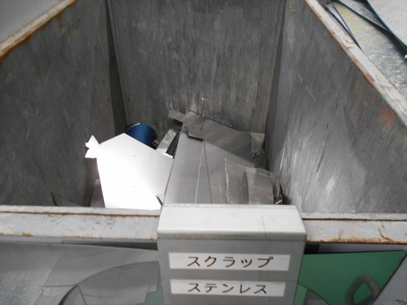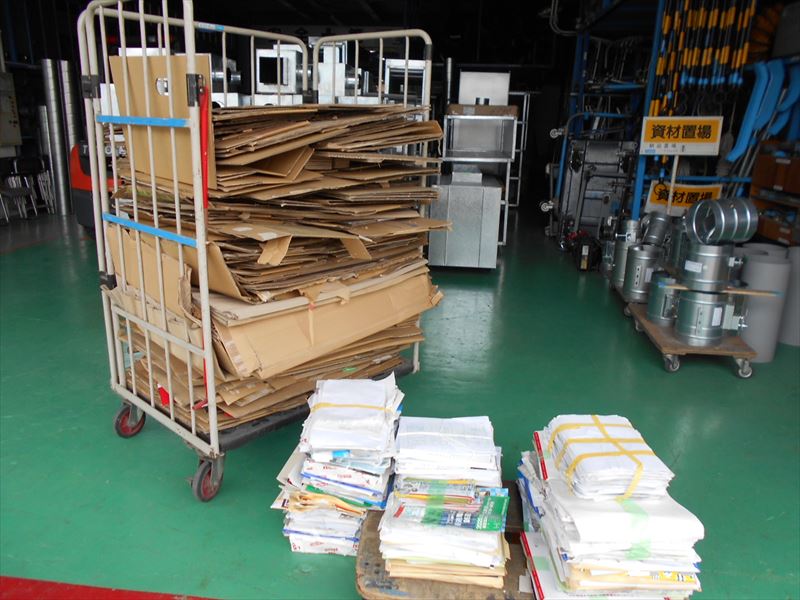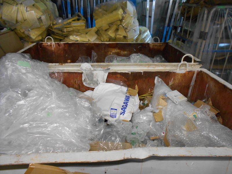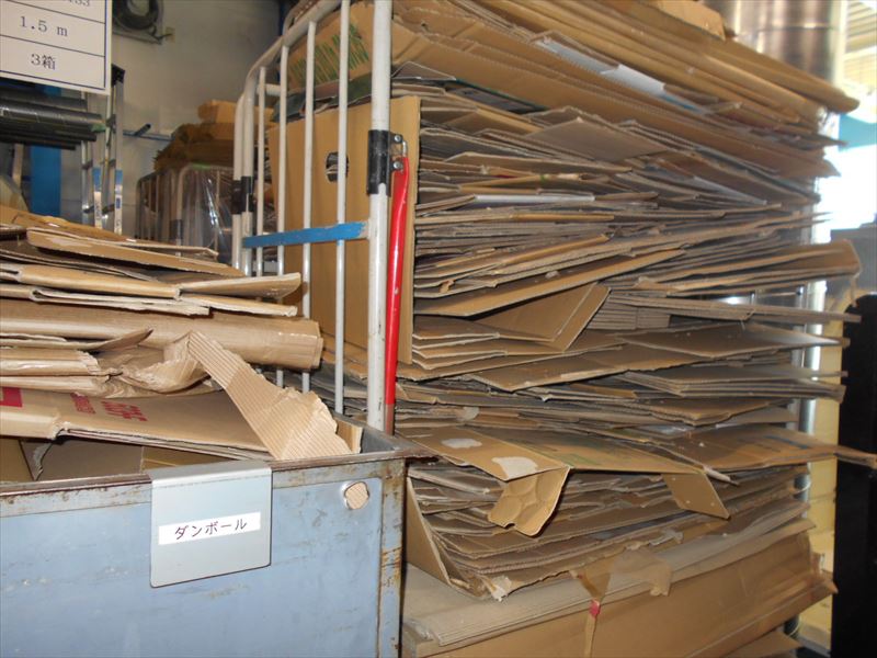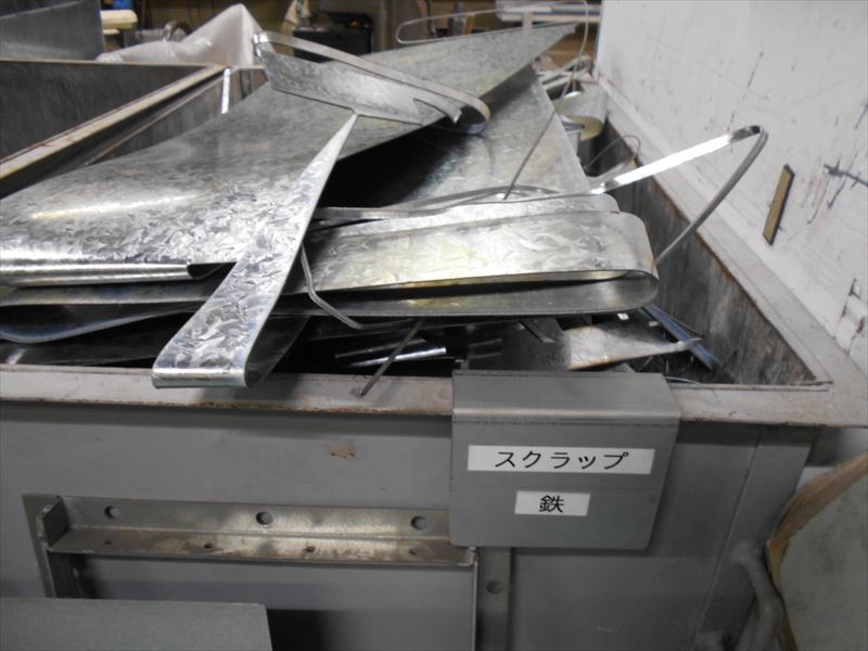 主に、写真上からスクラップ鉄類、ステンレス類、ダンボール類、混合廃棄物の4つに分別し置き場所を決めて廃棄業者に引き取ってもらうまで保管しています。