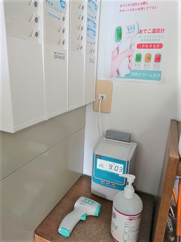 タイムカード設置場にアルコール除菌液と非接触の体温計を常設。