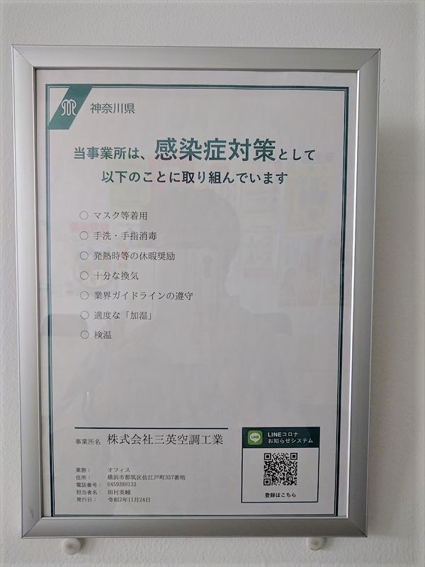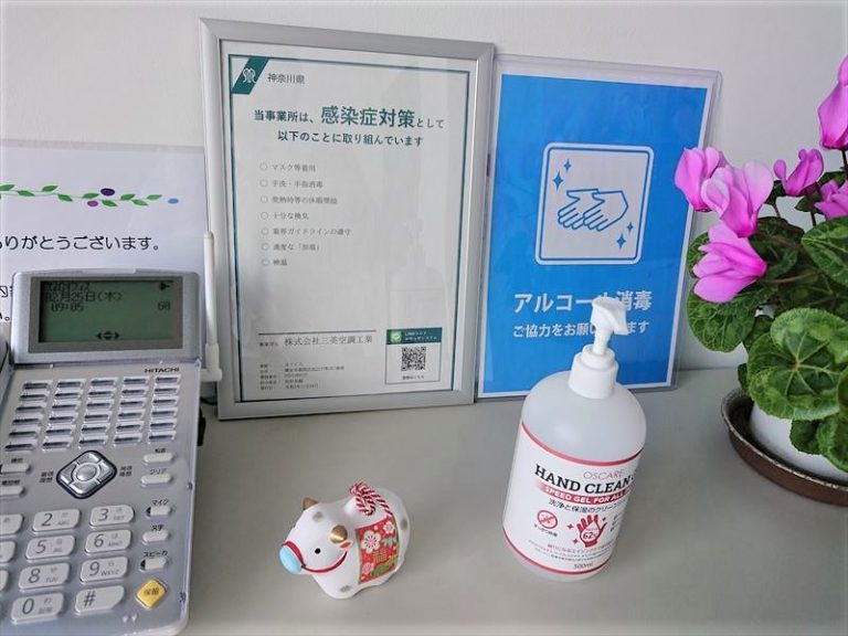 三英空調工業のある神奈川県では現在、新型コロナウイルスに対する緊急事態宣言の最中で、県内や全国の感染者数も減少傾向ですが、昨年より引き続き感染症対策に取り組んでおります。