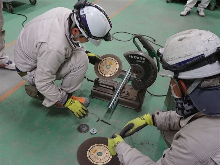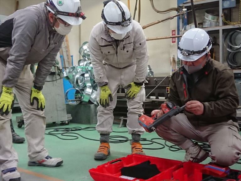 専務、工事部長を中心に、電動工具の基本操作方法を学び合います。