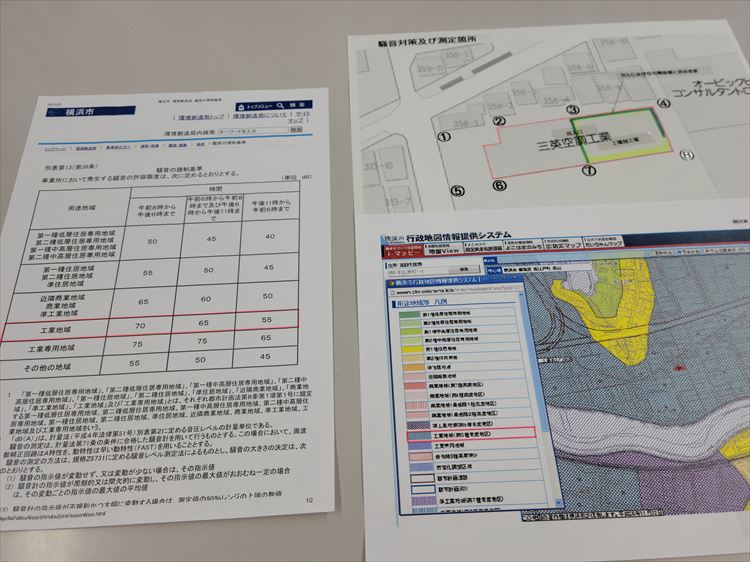 三英空調工業の所在する場所は、工業地域(第5種高度地区)に指定されており、騒音上限は70dB(8:00~18:00)となっており、工場稼働時に発生する音がこの数値を超えていないかを測定・確認します。