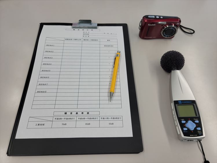 測定に使用する、騒音計・記録用紙・撮影用カメラです。
