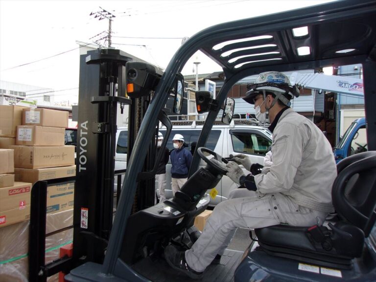 運転手と誘導者の二人一組になって、空の段ボール箱を荷物に見立て、実際に移動・積み下ろし作業を行いました。