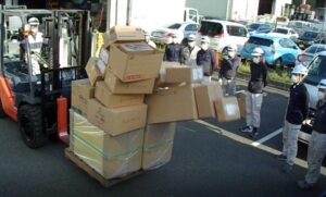 こちらは工場長による実際に荷崩れを起こしたときを想定しての実演、どのようなことが原因でどのような結果が起こるのか、実際に再現しています。(段ボールは空箱です)