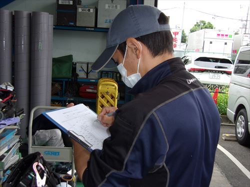 各車両ごとに積載工具、消耗部材等をリストに掲げ不備がないかチェックします。