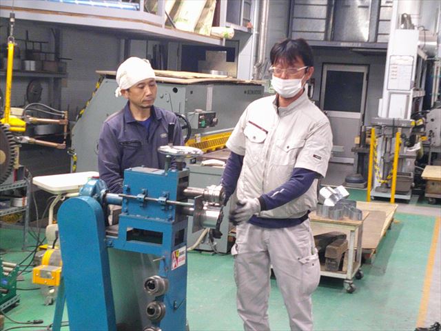 操作方法の注意、改善点を説明しながら、工場長が独自で開発した事故防止用具を実際に使用した実習を行います。