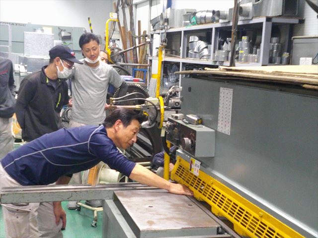 操作方法の注意、改善点を説明しながら、工場長が独自で開発した事故防止用具を実際に使用した実習を行います。