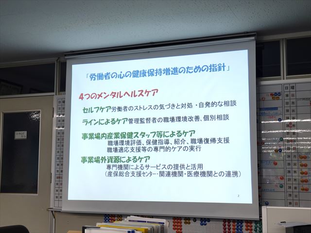 ストレスからくる身体の変調、または対処方法、リラクゼーション、その他セルフケアについてプロジェクターを用いてわかりやすく解説いただきました。