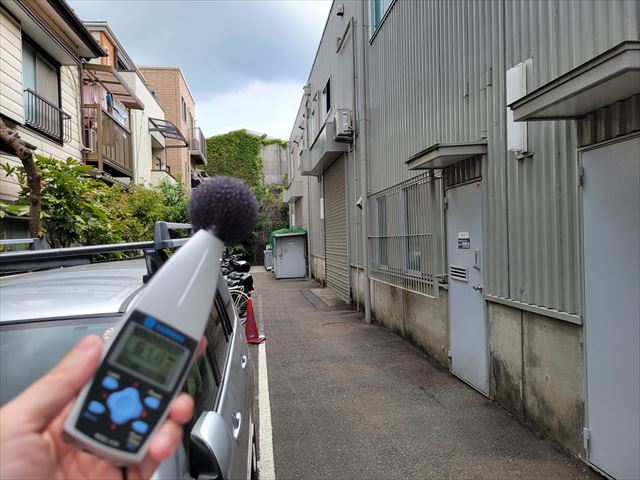 あとは、隣接している敷地境界線に限らず、当社から発生する音が周辺近隣に聞こえていないか歩いて散策し直接耳で聞いてみます。
